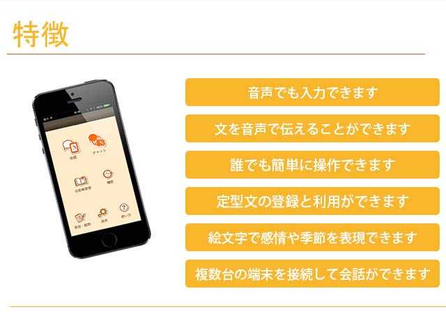 このアプリは、病気や障害で声を出せない方が電話や音声通話を使用する際に、音声連絡を支援するアプリです。GPS情報を基に位置情報を付加した音声情報を連絡することも可能です。また、英語や中国語で入力した場合でも、日本語音声により通話することができます。